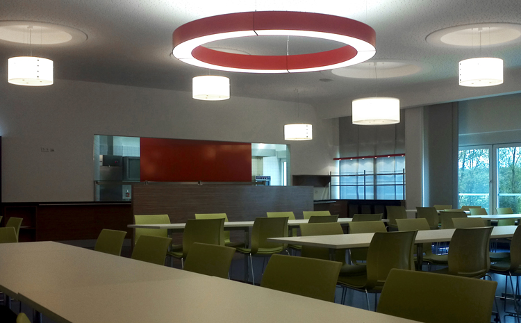 Direkte Ausstrahlung durch eine satinierte, opale Acrylscheibe, indirekte Ausstrahlung über eine klare Acrylscheibe, zusammengesetzt aus vier pulverbeschichteten Aluminium-Ringsegmenten, Durchmesser 220 cm, Querschnitt 20 x 18 cm, werkzeuglos höhenverstellbare Edelstahlseile – mit Standardlänge 150 cm, Pendelseilabhängung auch über einen zentralen Punkt möglich, transparente Netzzuleitung, andere Farbgebungen der Mantelflächen auf Anfrage möglich. Außendurchmesser 2200 mm.
